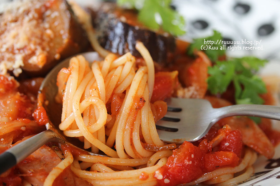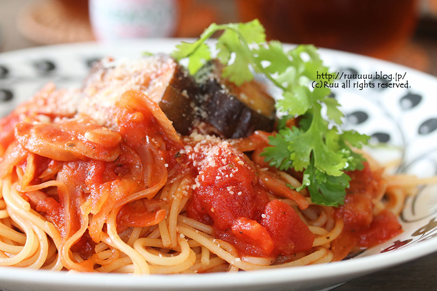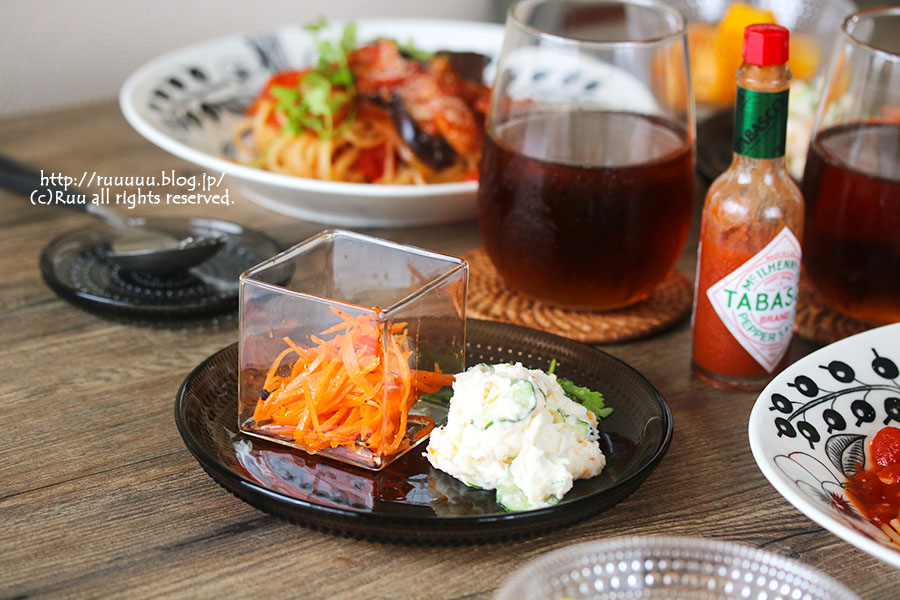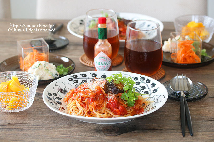 茄子とベーコンのトマトスパ・ポテトサラダ・キャロットラペ・マンゴー