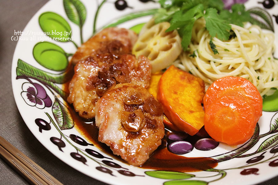 豚ヒレ肉のソテー ガーリックバター醤油・人参グラッセ・焼きかぼちゃ・焼きれんこん・パスタ・白菜の和風コールスローサラダ・白菜のミルクスープ・チョコバナナロール