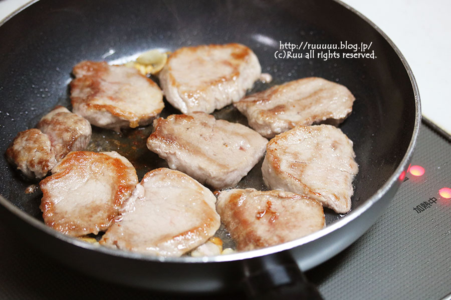 5:豚ヒレ肉が焼けたら取り出し、フライパンに油が残っていればキッチンペーパーなどで拭き取る。