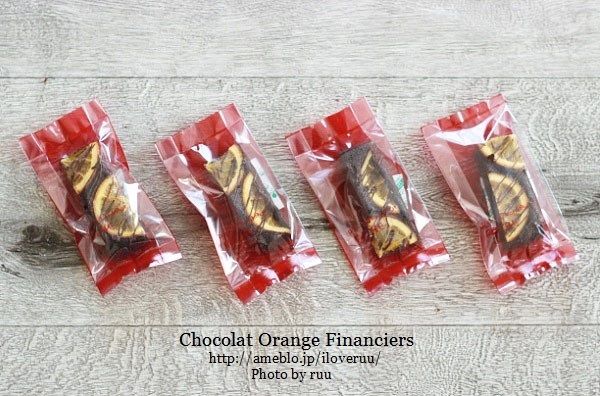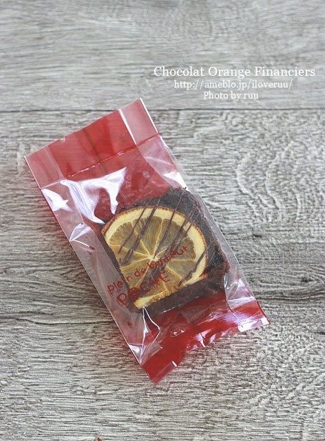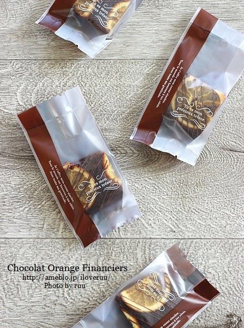 マフィン型で焼いたフィナンシェ(オレンジのせ忘れ)を、透明マットのガス袋に入れ、