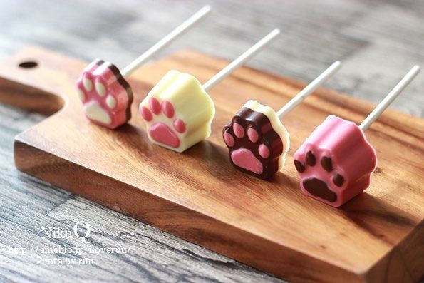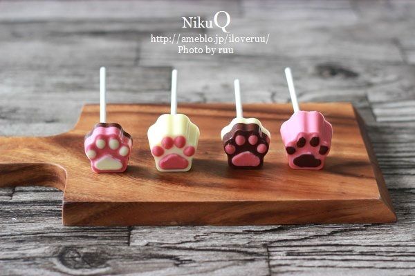 白肉球にピンクチョコ+黒チョコ、ピンク肉球に白チョコ、ピンク肉球に黒チョコ+白チョコ、黒肉球にピンクチョコ。