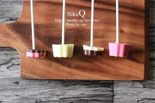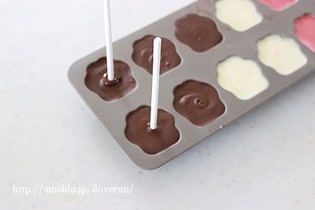 チョコレートがサラサラの状態でスティックをさしてもちゃんと立たないので、スティックは軽く冷やし固めてから。