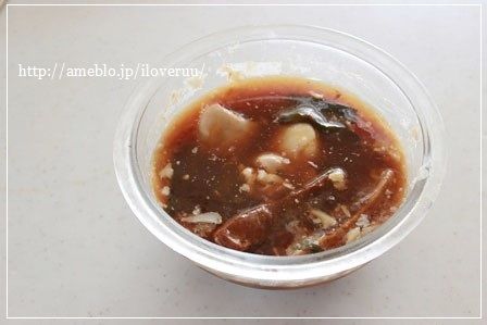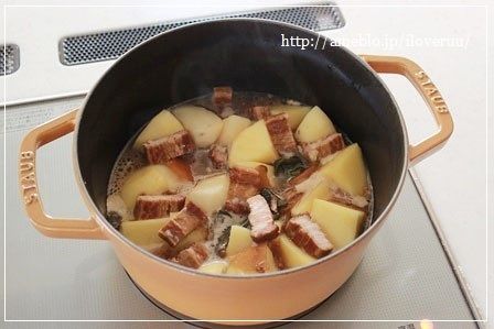 角煮の煮汁を全部入れて、2切れだけ残ってた角煮は1cm角の細切りにして、蓋をして10分~15分。