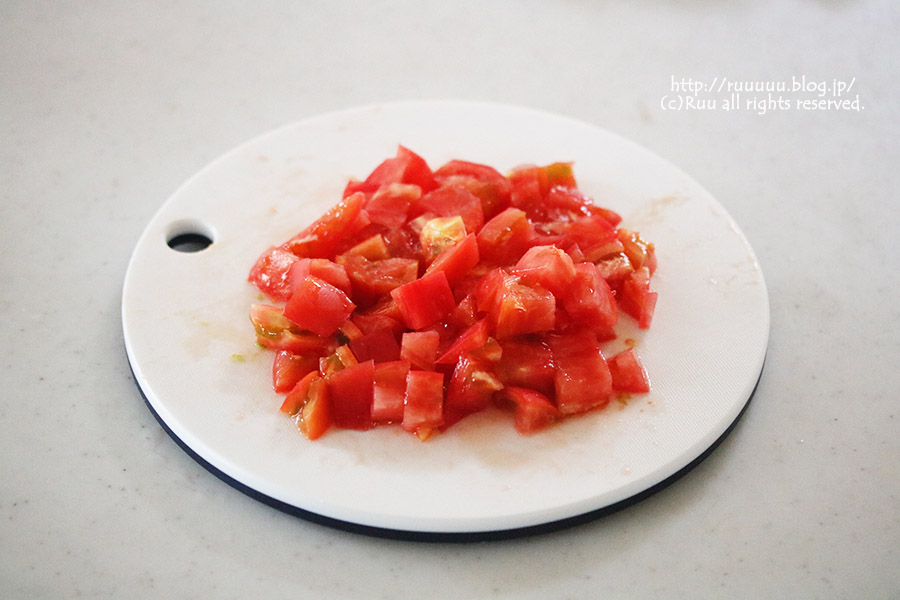 4:冷ましている間にトマトを1cm程度の角切りにする。