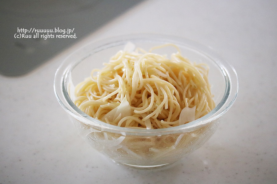 完全に冷えたパスタにサラダ油をからませ、