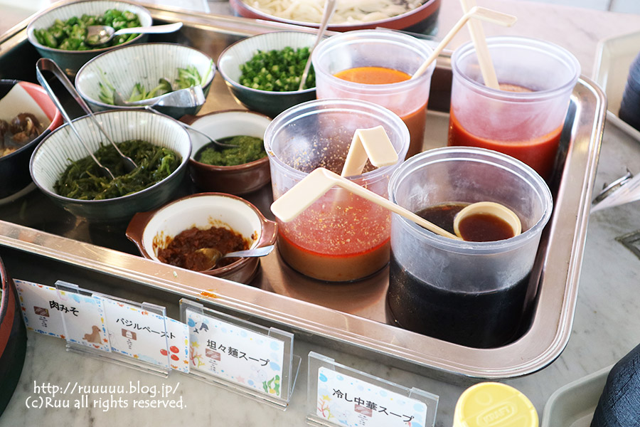スープは、坦々麺スープ、冷やし中華スープ、めんつゆ、海老味噌スープ、トマトスープ。と、5種類。