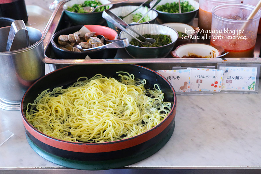 具は、あさり、おくら、ネギ、揚げ玉、肉味噌、バジルペースト、きゅうり、昆布、粉チーズ。と、9種類。