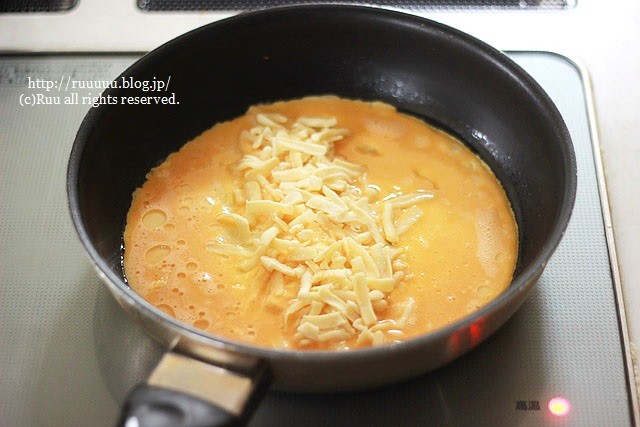 7:1の卵を流し入れたら火を弱め、シュレッドチーズをのせる。