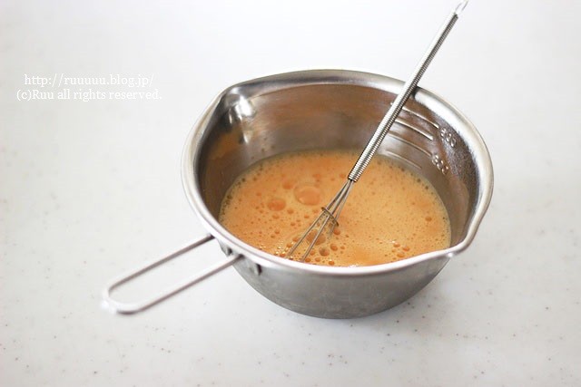 1:卵は溶きほぐし、塩・胡椒と牛乳を入れて混ぜる。