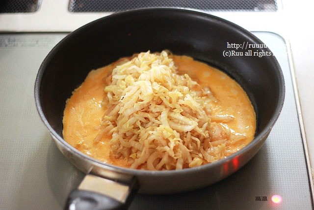 8:程よく卵が固まったら、5の白菜をのせる。