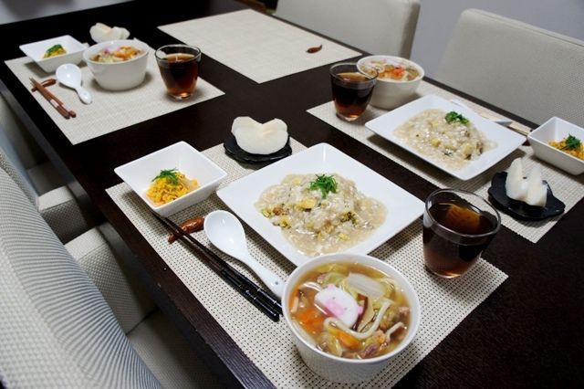 おばんですーおかめですもといるぅです本日の晩ご飯 ネギと卵のあんかけ炒飯・八宝菜うどん・菊のキムチマヨ和え・梨今日はおかんがいないので3人分。我が家3人の時は手抜きです。3人の時は基本30分でできる晩ご飯。しかも今日何だか食欲なくてねー。あたしはうどんだけ食べ