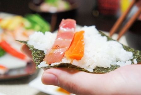 こちらは昨日の続きです。手巻き寿司準備編はこちら→手巻き寿司①ほんでは。手巻き寿司開始~!さぶろー山「うんとね。俺はね。まぐろと、サーモンとー。」 ちゃっちゃと乗せるさぶろー山。手巻き一回目にして、どれだけの具を乗せる気でしょうか。さぶろー山「鯛と、鯛と・