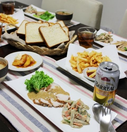 今日は友達とモーニングデートを予定しててさ。もうちょっとしたら友達がやってくるので、さささささーっといきます。さささささーっと晩ご飯。 スモークチキン風・ごぼうサラダ・フライドポテト・オモロイ角食・キャラメルりんご・焦がし玉ねぎとかぶのうまうまスープこの前