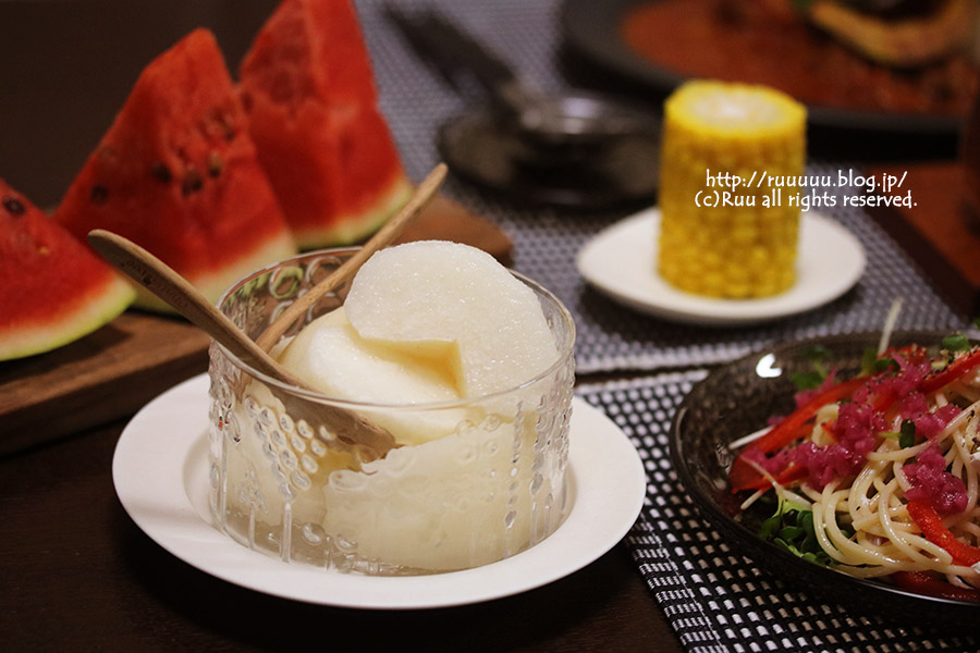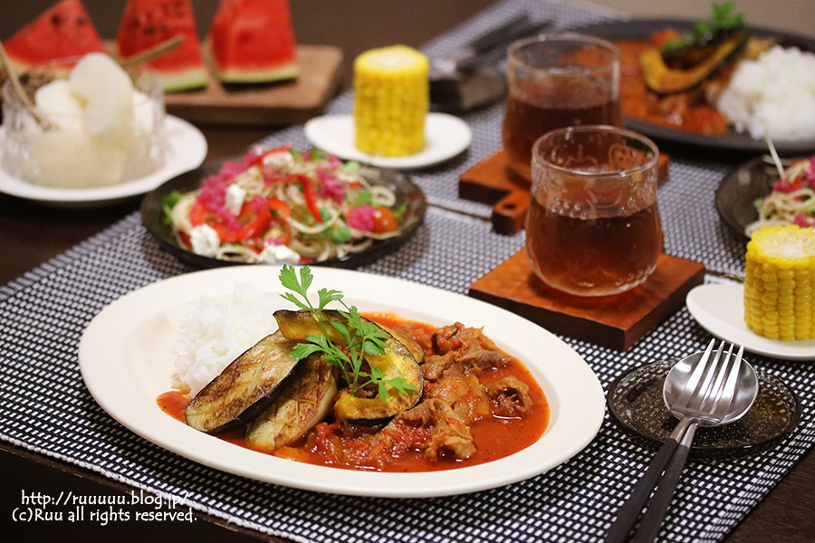 牛筋のトマトソース煮かけご飯 焼き茄子とかぼちゃ添え・いろいろ野菜とクリームチーズのサラスパ・とうもろこし・梨&すいか