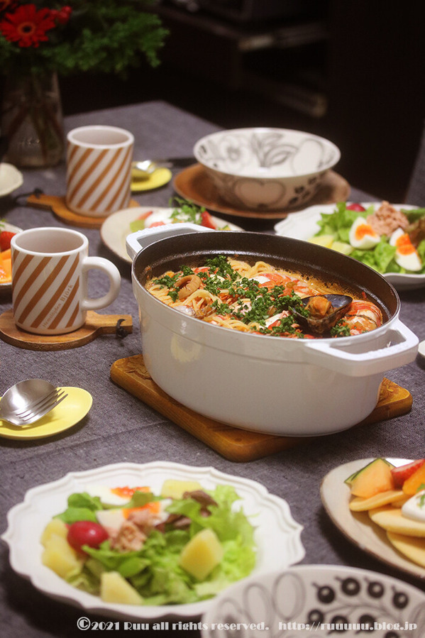 ブイヤベースパスタニソワーズサラダフルーツパンケーキメリークリスマス!イブ!今日は、良い子が夢みるクリスマス。テーブルにはたくさんのご馳走と華やかなケーキが並び、きらきら光るツリーにどこからともなく聞こえるジングルベルの音。世界中の子供達が明日への希望を