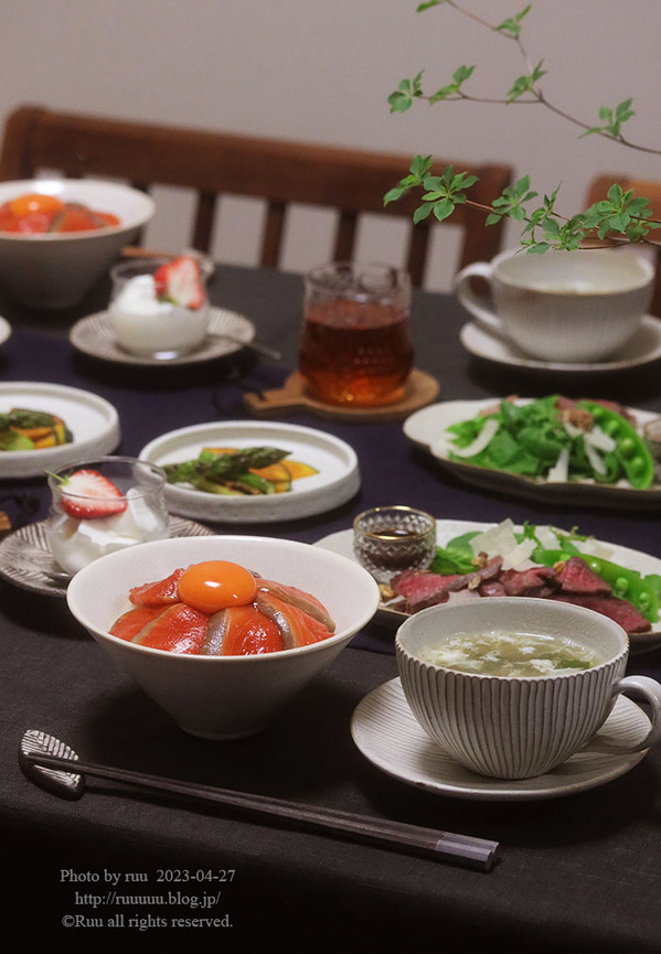 【献立】サーモンのユッケ丼と、試作のお肉と、焼き野菜などなど。~特技は洗濯です。洗濯なんです~