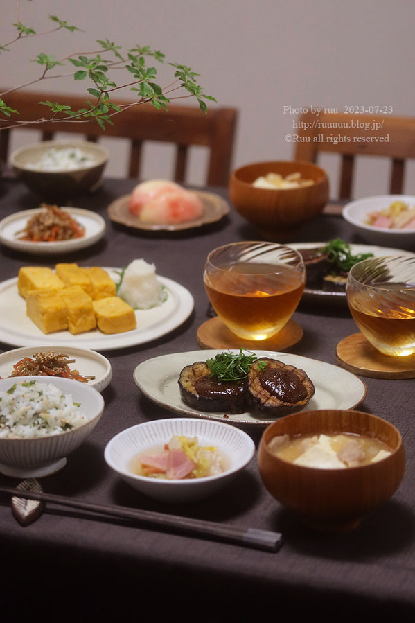 米茄子の田楽出汁巻きたまごごぼうのきんぴら白菜とベーコンの出汁煮釜揚げ海老とわかめの混ぜご飯豚汁桃あれだけ声高らかに出発したのに、初日にしてホームシックになったおかん。その後、私の元にも「涙が出る」「涙が止まらない」「今までありがとう」に付け加え、今まで