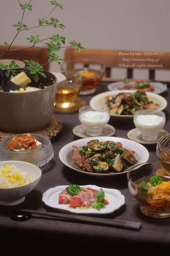 カリカリ豚ととろとろ茄子のニラまみれキムチ奴トマトの生ハム巻きとうもろこしご飯冷やしふし麺ミルクヨーカンここにきてようやく終わりと床とクローゼットの壁が見え、私たちのやる気に光が灯った昨日。私「この勢いで全部片づけるぞおおおおおおおおおおおおおおおおおお