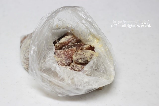 5:ポリ袋に片栗粉と水気を切った4を入れ、袋の口を押えてふる。