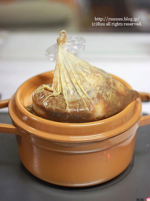 温かい鍋の上に卵&タレ(ポリ袋入り)を置き、鍋の熱でほかほか。的な。
