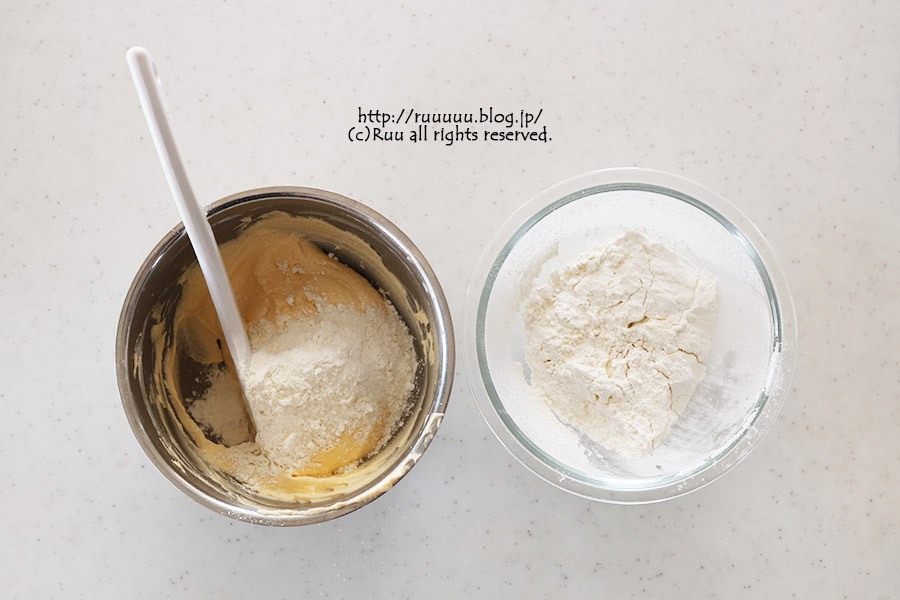 4:ふるっておいた粉類を3~4回に分けて加え、ゴムベラで混ぜる。