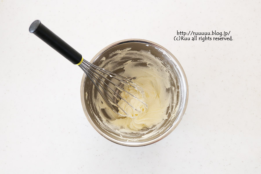 2:ゴムベラで練ったバターに上白糖を加え、泡だて器で白くふんわりするまで混ぜる。