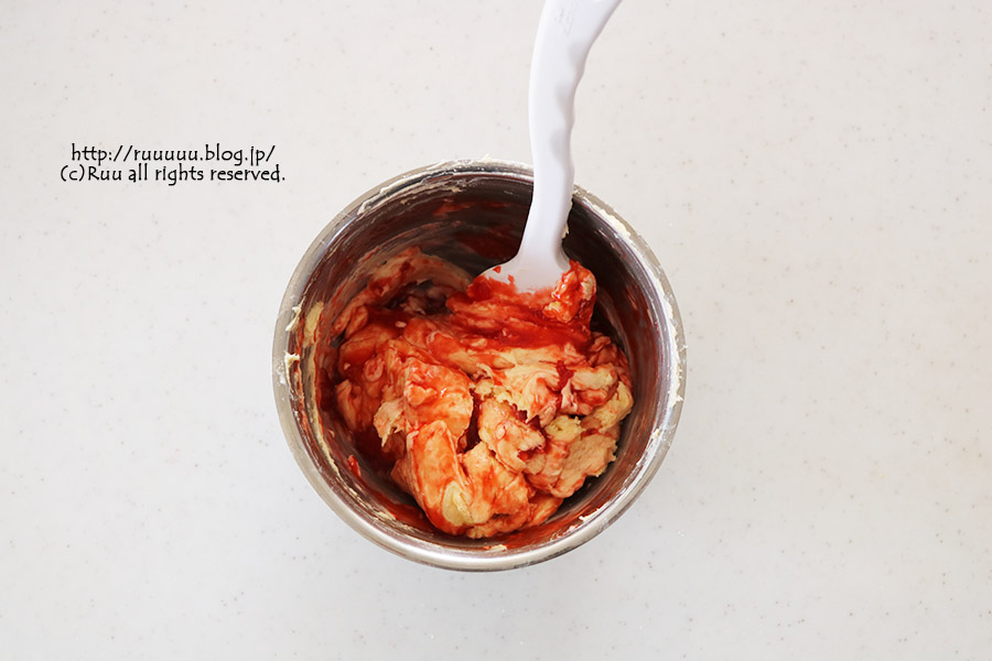 生地と馴染むまで混ぜるといちごのゴロっと感がなくなるので、混ぜるのは大きく2~3回だけ。画像くらいで止めてOK。