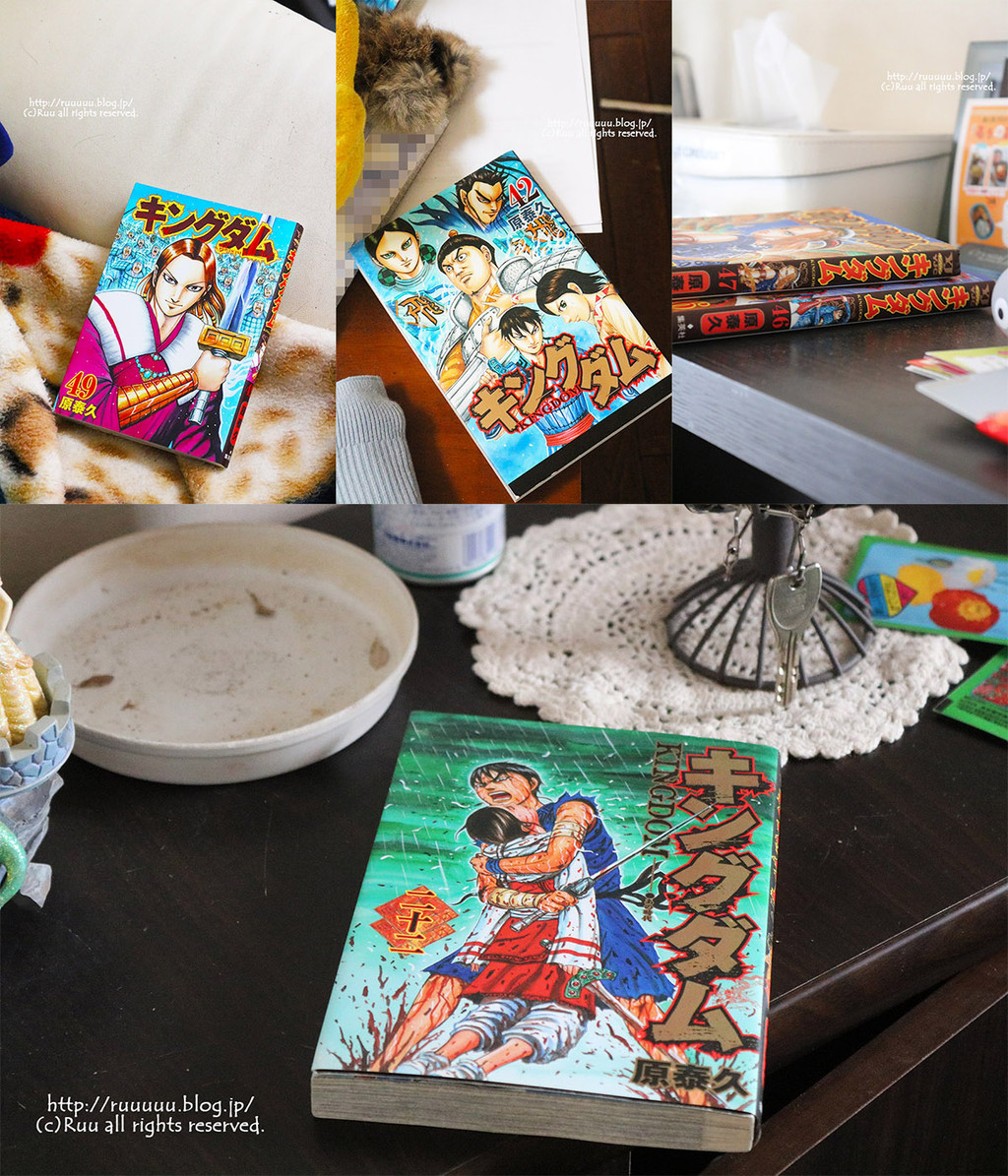 ソファの上からキングダム、テーブル上からキングダム、TVの上からキングダム、玄関からキングダム、洗面台からキングダム、洗濯機上からキングダム、家中からキングダム・・・。