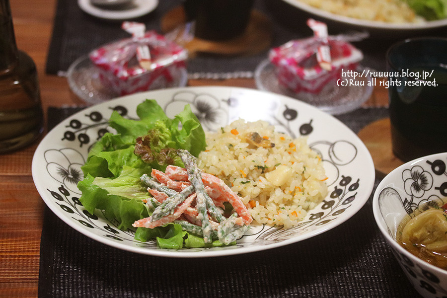 ロールキャベツ・シーフードピラフ・アスパラと人参のサラダ・信玄餅
