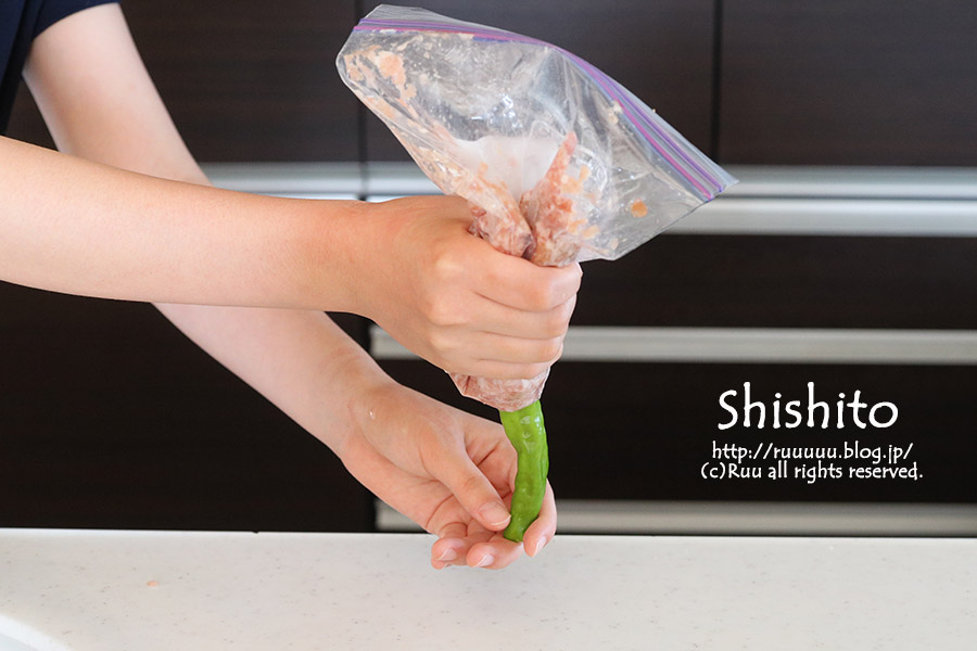 6:3のししとうに肉ダネを詰める(菜箸で押し込みながら入れると先っぽまで肉ダネが入ります)。