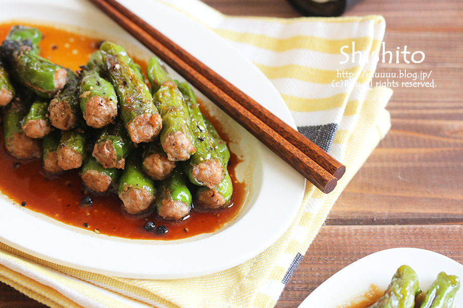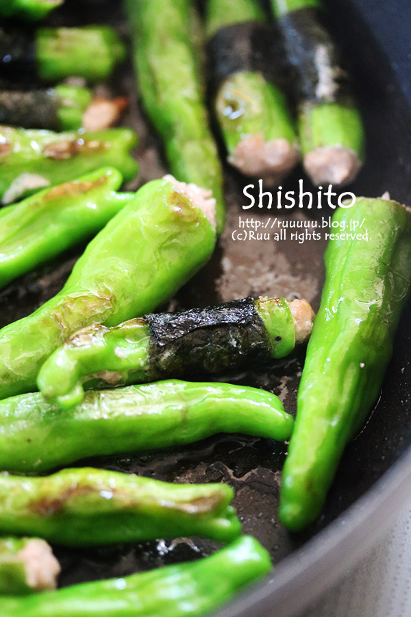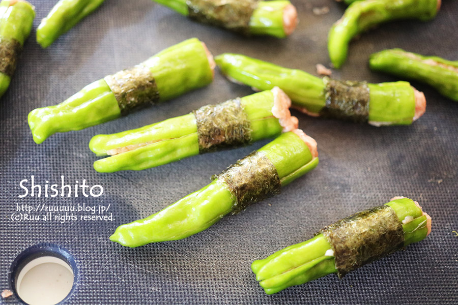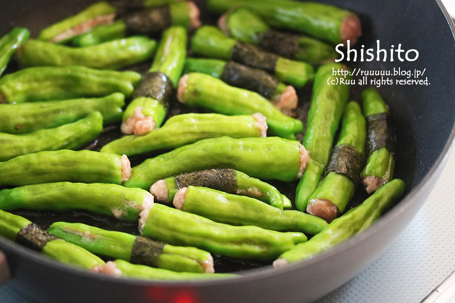 海苔無しでシシトウパッカーンと開いちゃったらどうしようかと思いまして、片栗粉を肉ダネに少し足して肉のまとまり良さげ(←気持ちの問題なので無くても大丈夫かもしれませぬ)にしてみました~。