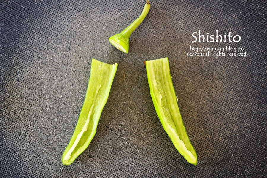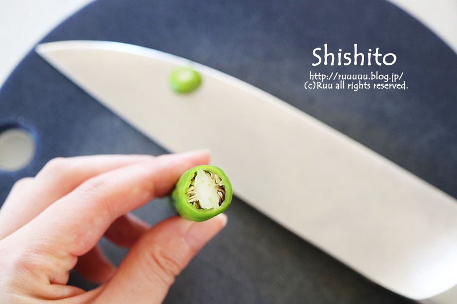 1:ししとうのヘタを落とし、包丁で縦半分に切り、指で種を取る。