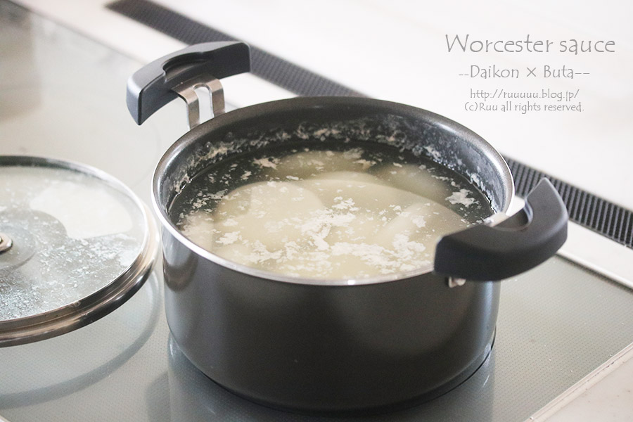 1:大根は厚さ2cm程度の輪切りにし、面取りがしたければ面取りをし、できたら米のとぎ汁で下茹でし、そのまま冷ます(下茹ですると雑味がなくて美味しいんですが、面倒な場合は切るだけでいいです)。