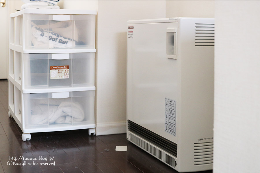 蓄暖の上に皿、拭出口前には衣装ケース。