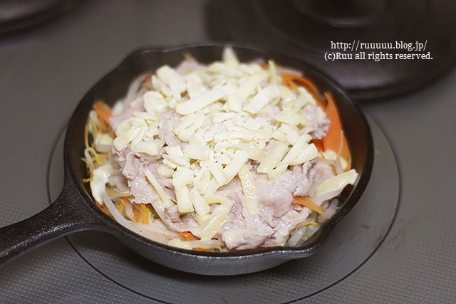本家本元のレシピはここ(→豚小間もやしのチーズ蒸し)ですが、