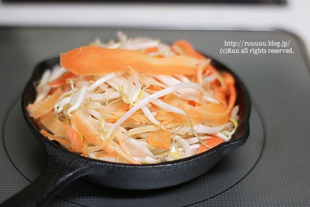 1:スキレットにもやしと人参を入れ、上から手でぎゅっと押しつぶす。