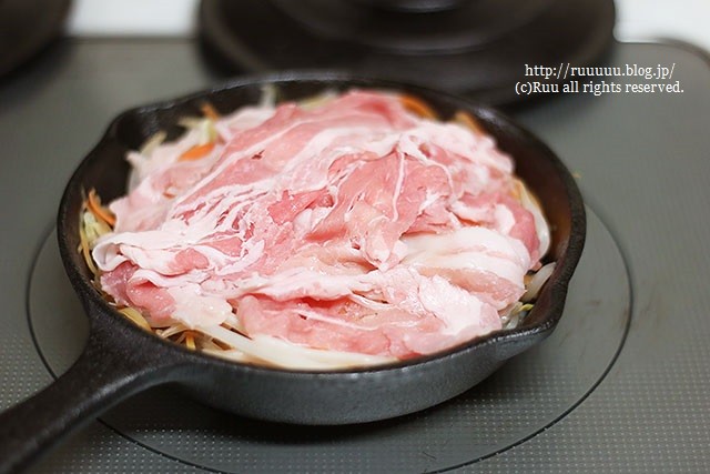 3:野菜が少ししんなりしたら、豚肉をのせる。