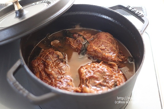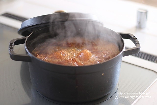 (ストウブ以外の鍋を使う場合は、焦げ付かないよう水を足しながら煮て、煮汁が多ければ煮詰める感じで)