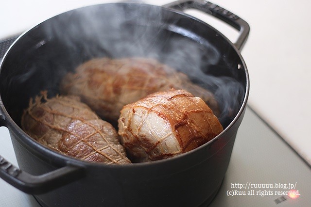 1:豚肉はタコ糸で縛るか、ネットに入れる。