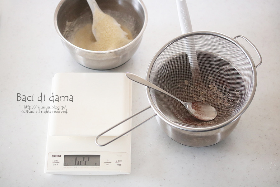 計りの上にボウルとザルを置く→プレーン生地用粉類を計りながら振るい入れる→ココア生地用粉類を計りながら振るい入れる。ってすると一度に全部済んで楽です。