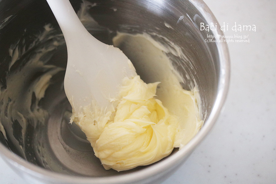 1:バターは室温に戻し、ボウルに入れてゴムベラで練る。
