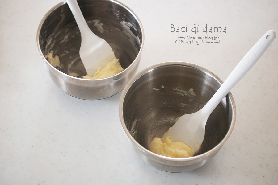 バターの水分&油分だけで粉類をまとめるので、必ず柔らかく練ってください。バターが固いと粉を入れた時にまとまらないよ!