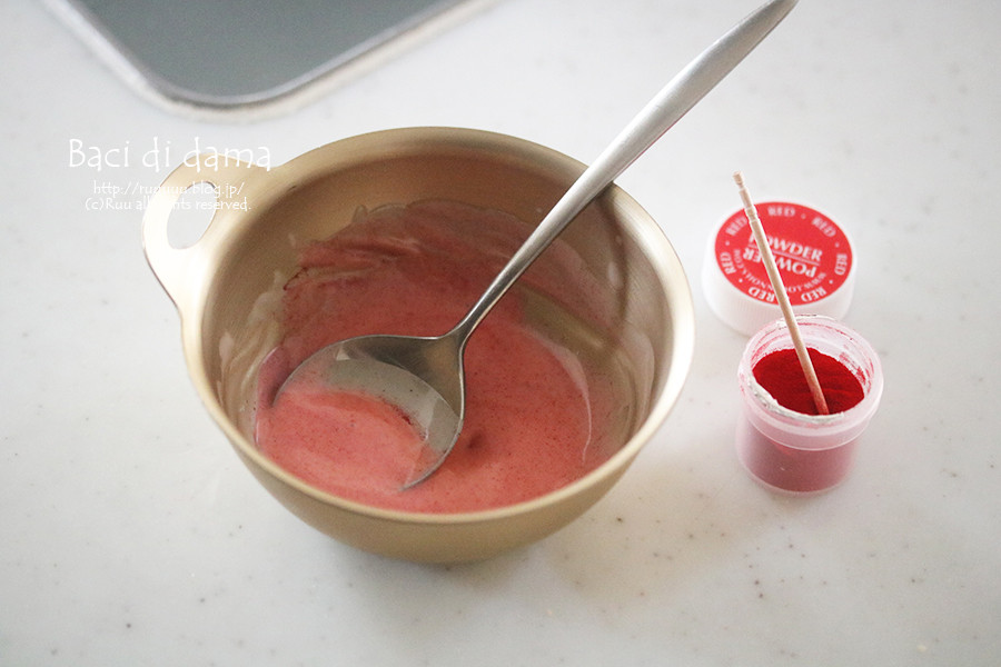 チョコが固まったら、残りのホワイトチョコに着色料を入れて赤く染め、