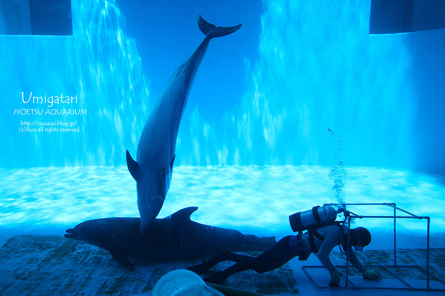 水槽をお掃除するお兄さんと、お兄さんと一緒に遊びたいイルカと、それに刺さるイルカ(ほんとシュール)。