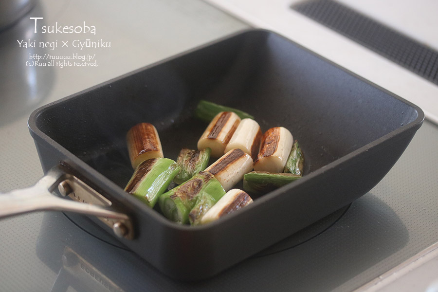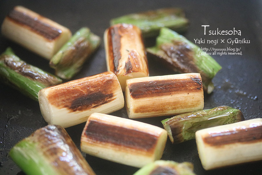 2:フライパンに油を熱し、強火で長ネギを転がしながら焼く(焦げかな?ってくらい焼いてOK)。