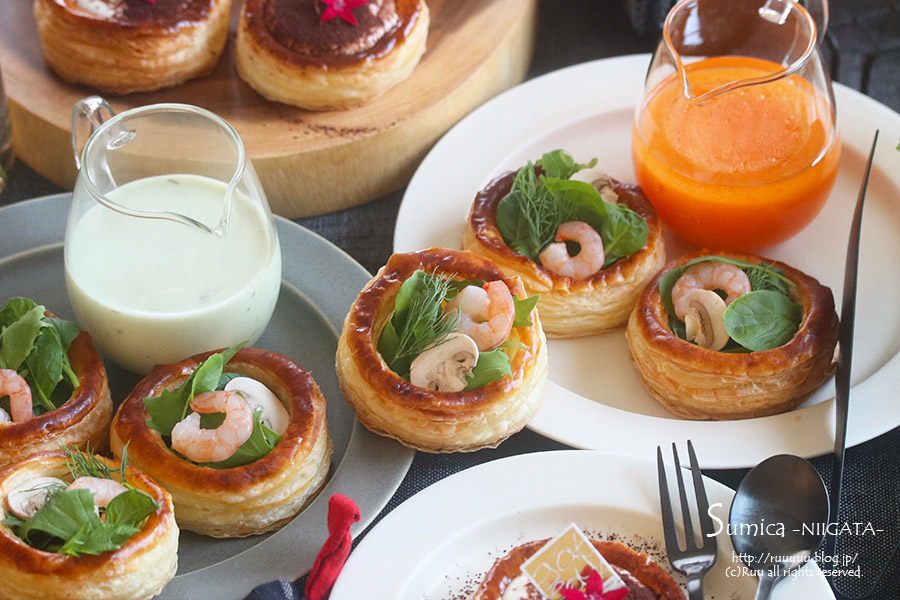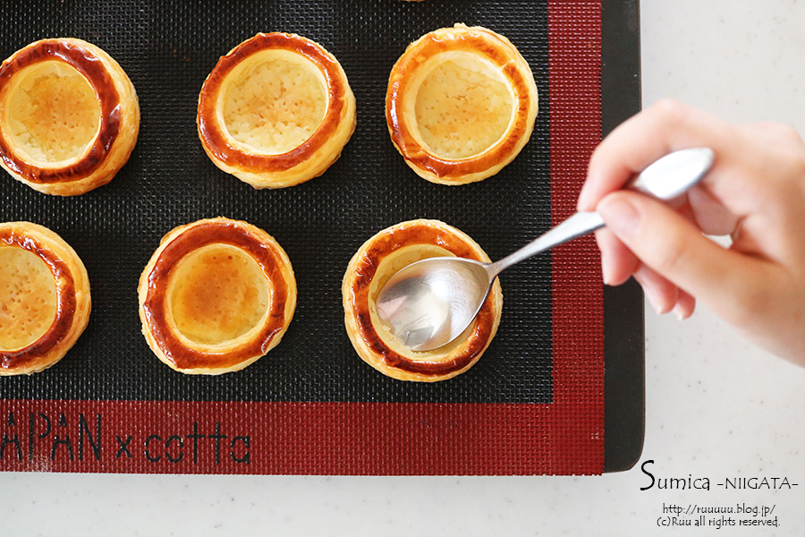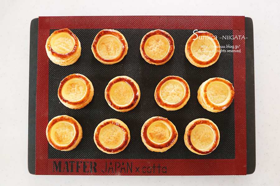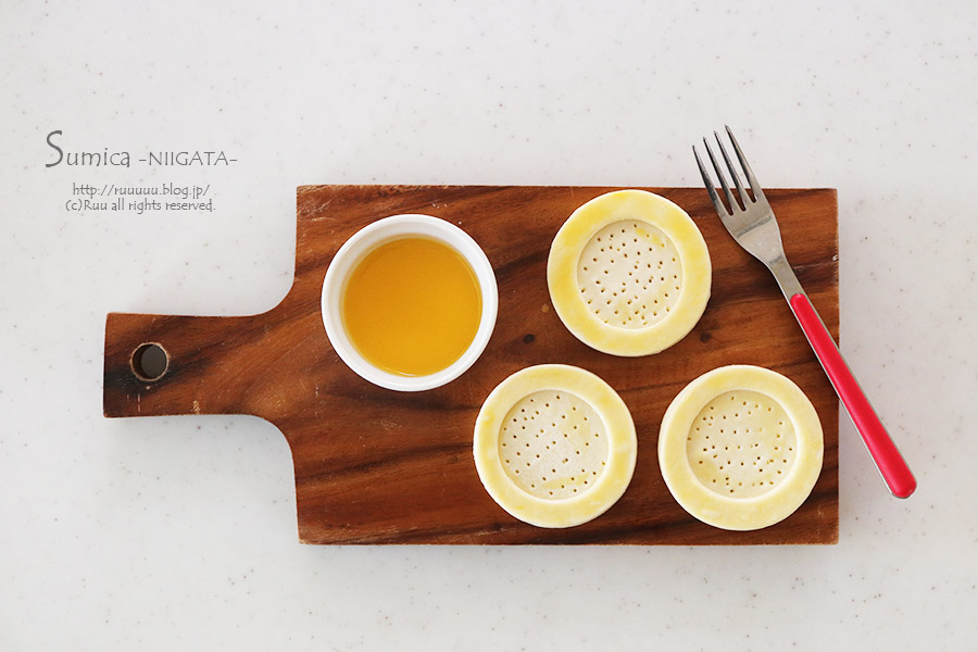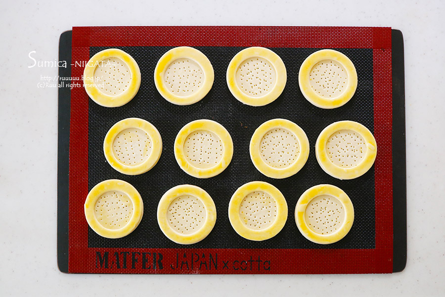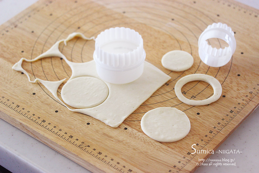 ここで使っているパイ生地は、14×21cmの生地で、7cmの丸型がちょうど6枚抜けたので、7cmと5cmの丸型を使いましたが、