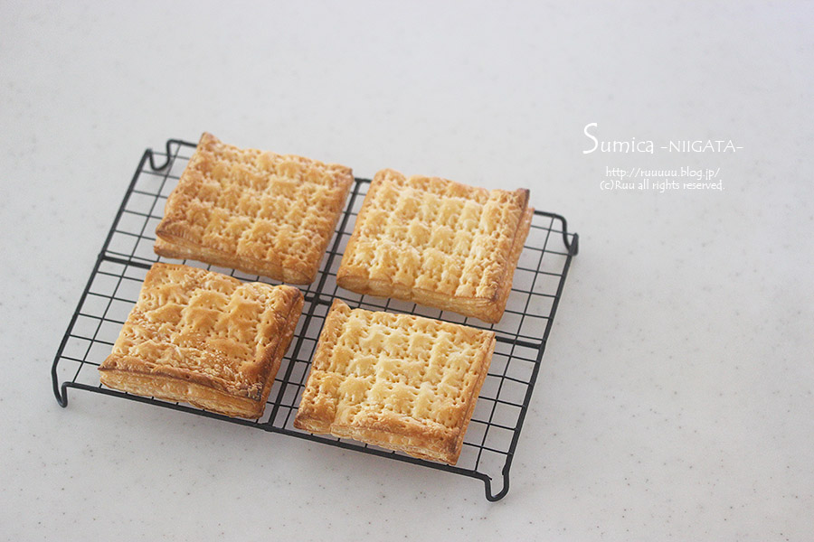 まず、解凍したパイシートを7~10cm角に切り、200℃に余熱したオーブンで17~18分ほど焼きます。