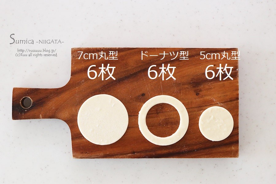 (左:7cmの丸型×6枚 真ん中:7cmの丸型の真ん中を5cmの丸型で抜いたドーナツ型6枚 右:5cmの丸型6枚)