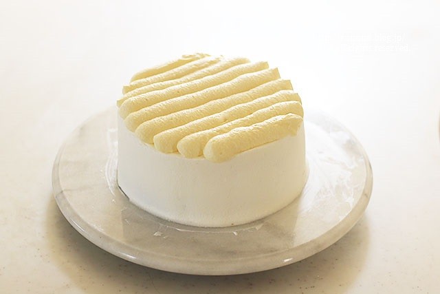 この後生クリームを全面に塗るので、絞る位置はシフォンの高さまで。こんもりと絞らないように。
