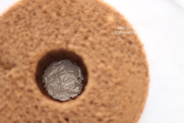 12:シフォンケーキの真ん中の穴部分にラップを敷く。